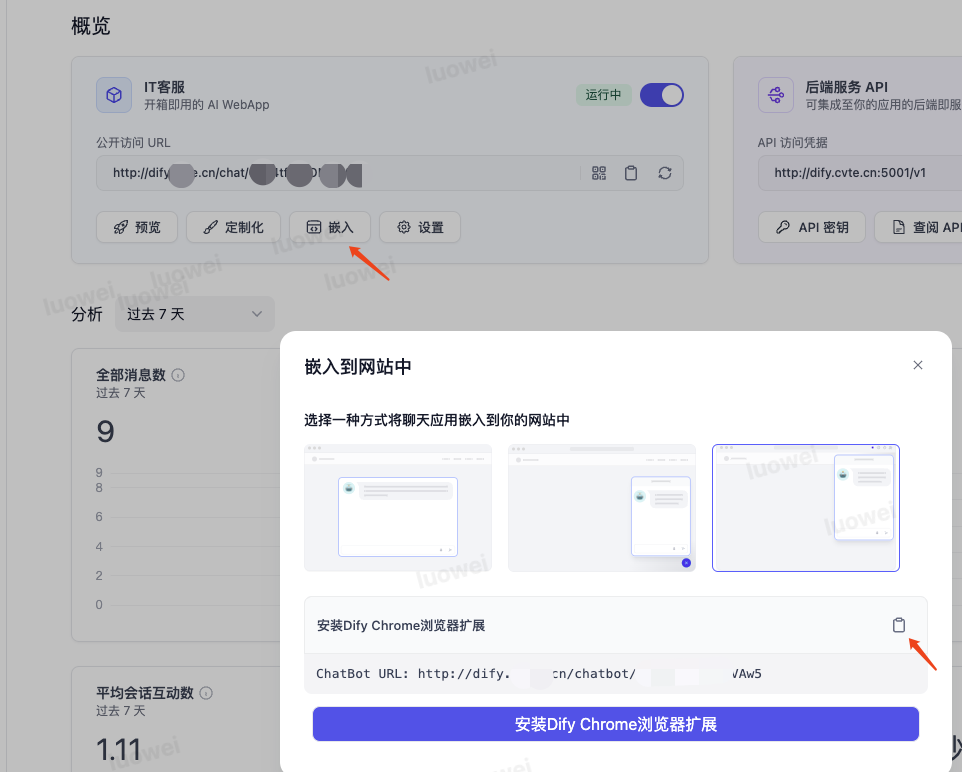 • 创建Dify应用配置,在应用概览中点击嵌入,切换到安装Chrome浏览器扩展视图,点击copy按钮获取ChatBot Url,如图: