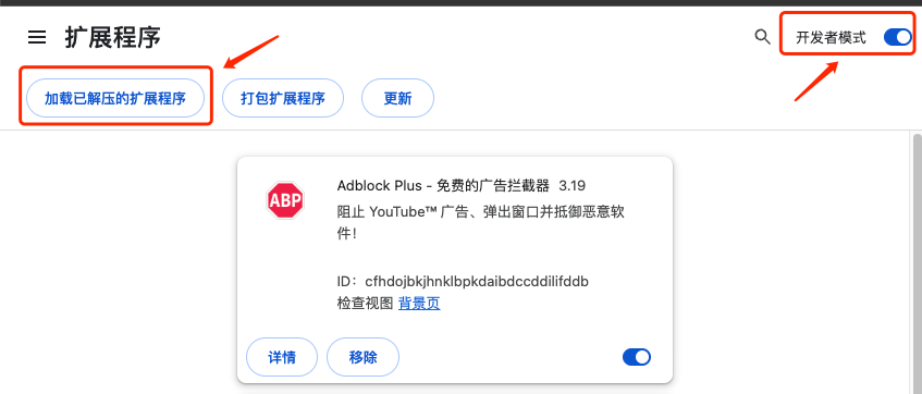 • 选择开启 “开发者模式”,并点击 “加载已解压的扩展程序”